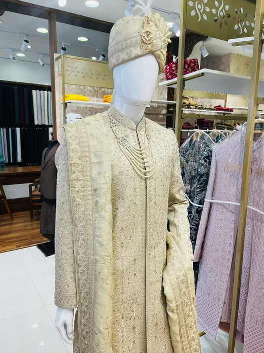 Golden Attire | Beige Embroidered Groom Sherwani | Luxury Custom Indian Wedding Sherwani | All Over Thread Work
