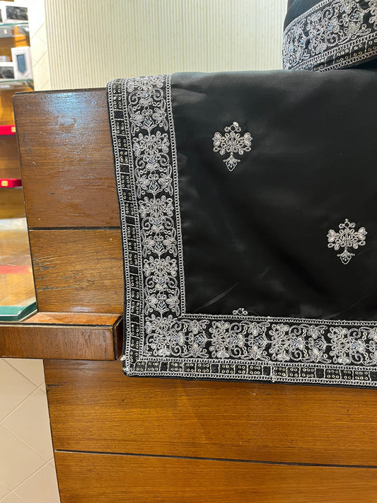 Groom Black Safa Turban & Shawl Set | Velcro Adjustable Sherwani Pagri with Grey Embroidery