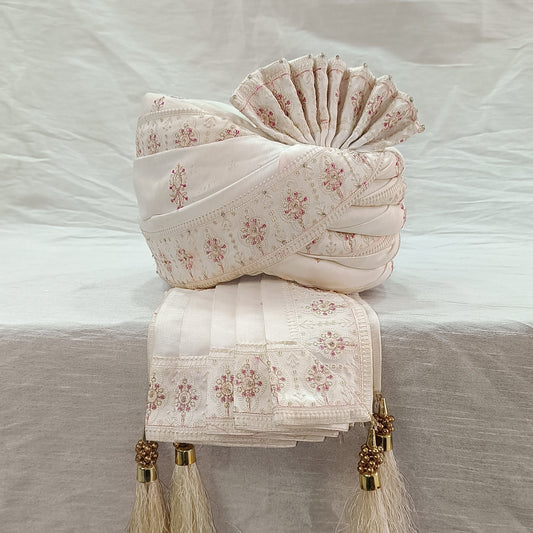 Off-White Groom Turban & Shawl Set with Delicate Pink Buti Embroidery