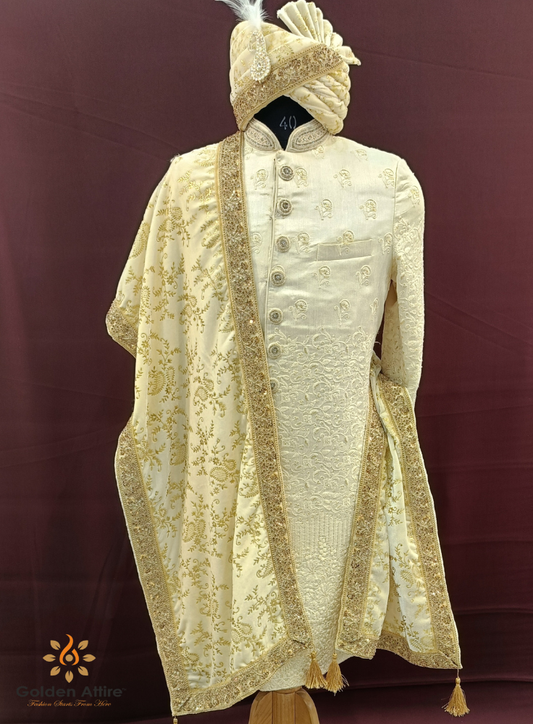 Golden Attire | Beige Embroidered Groom Sherwani | Luxury Custom Indian Wedding Sherwani | All Over Thread Work