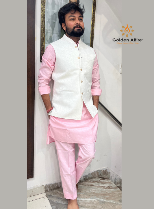 Stylish White Nehru Jacket with Pink Kurta Pajama Set
