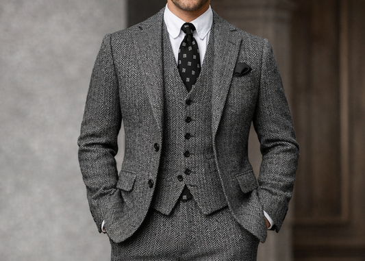 Charcoal Grey Herringbone Tweed 3-Piece Suit, Elegant Groom & Wedding Suit