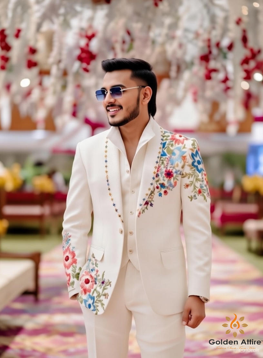 Off-White Zardozi Embroidered Elegant Groom Suit, Hand-Blocked Printing, Custom Indian Wedding Outfit