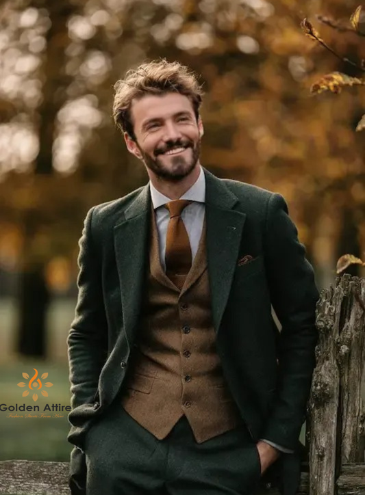 Premium Green Tweed 3-Piece Wedding Suit. Elegant Groom Outfit with brown Waistcoat