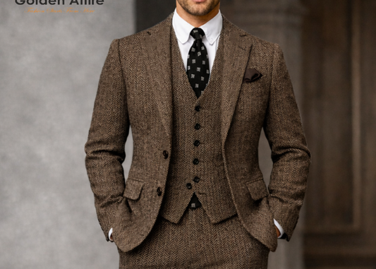 Premium Brown Tweed Wool Three-Piece Suit | Elegant Groom & Wedding Suit