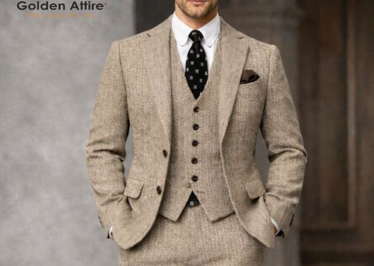 Beige Herringbone Tweed Wool Three-Piece Suit, Elegant Winter Groom Wedding Suit