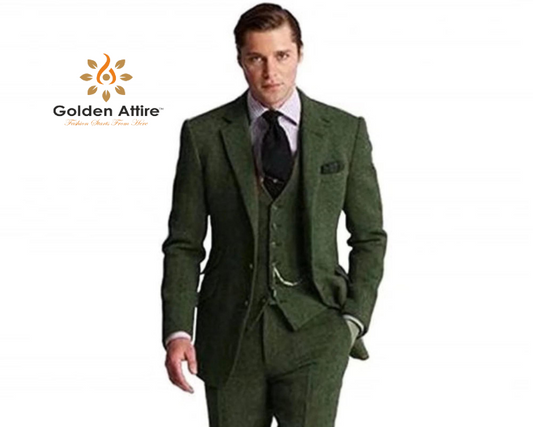 Classic Green wool Tweed Men Suit, 3 Piece Suit, vintage suit, Bespoke Suit, Classic Elegance, Modern Comfort