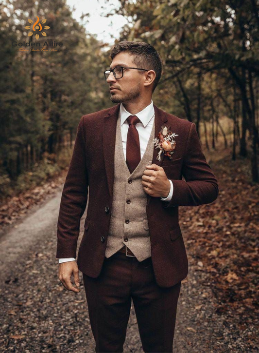 Men's Custom Brown Tweed 3-Piece Groom Suit | Comfortable Luxury Wedding Suit