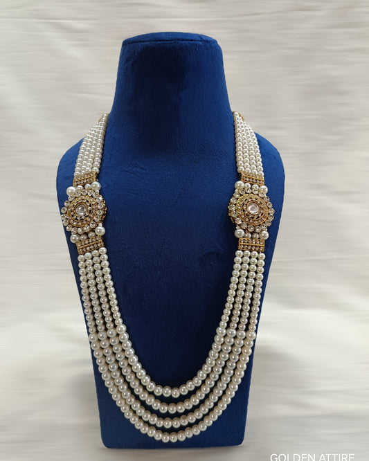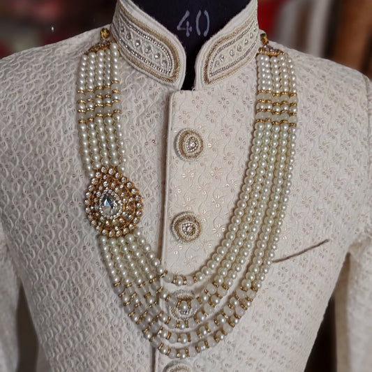 Golden Attire | Off-White Groom Mala Necklace | 4-Layered Pearl Mala with Stone Brooch & Kantha Detailing | Sherwani Jewelry