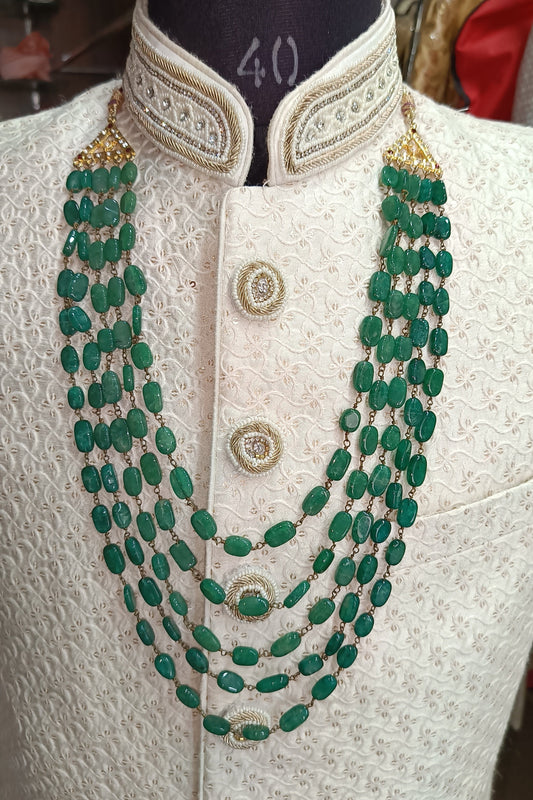 Green Elegant Indian Groom Kantha | 5-Layered Pearl & Panna Mala with Stone Detailing | Sherwani Necklace | Golden Attire