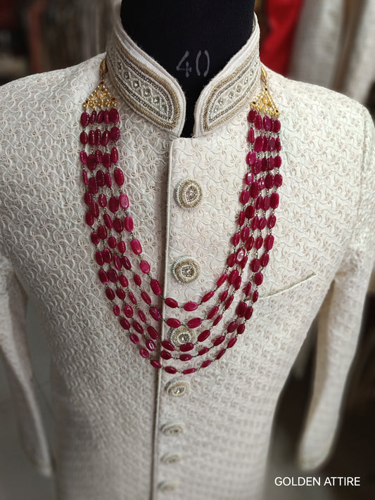 Indian Groom Mala 5 Layered Pearl Necklace | Ruby Stone Detailing | Uber Rich Kantha Panna Mala | Sherwani Necklace | Golden Attire