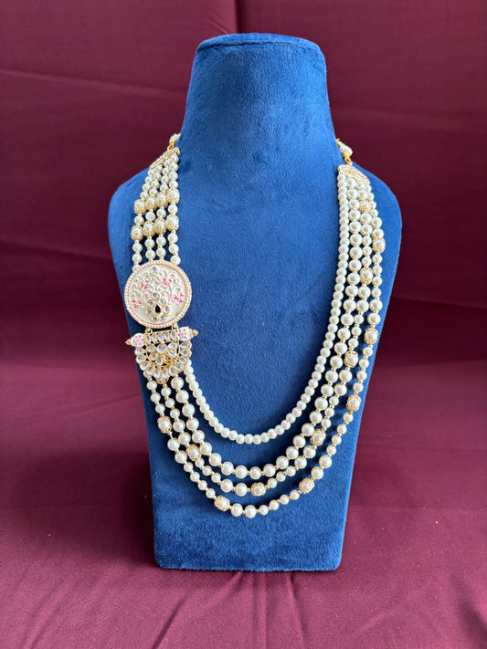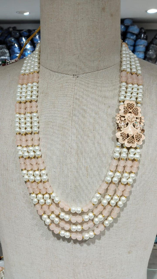 Peach & Pearl Majesty 4 Layer Indian Groom Mala with Kantha Brooch & Stone Detailing | Sherwani Necklace