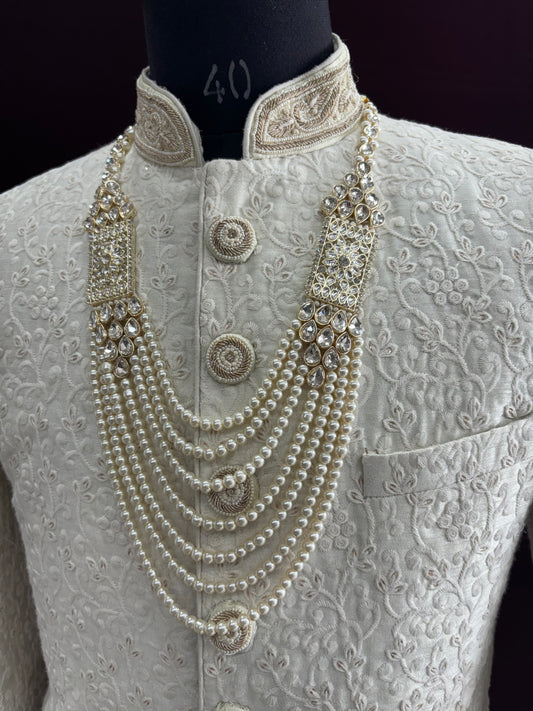 Golden Attire | Ivory 7-Layered Pearl Mala Groom Necklace with Stone Detailing | Sherwani Wedding Accessory