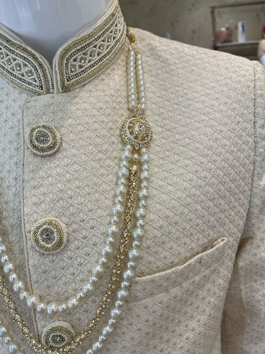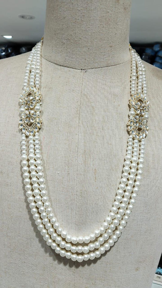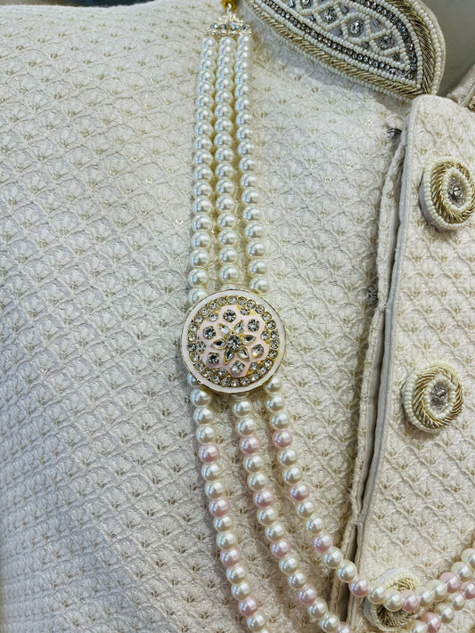 Ivory Elegance: Three-Layered Pearl Mala Groom Necklace with Exquisite Stone Detailing for Sherwani Perfection