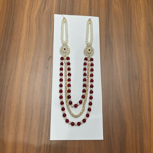 Regal Red Three-Layered Pearl Mala Necklace for Grooms | Stone-Embellished Sherwani Jewelry | Traditional Wedding Mala for Men