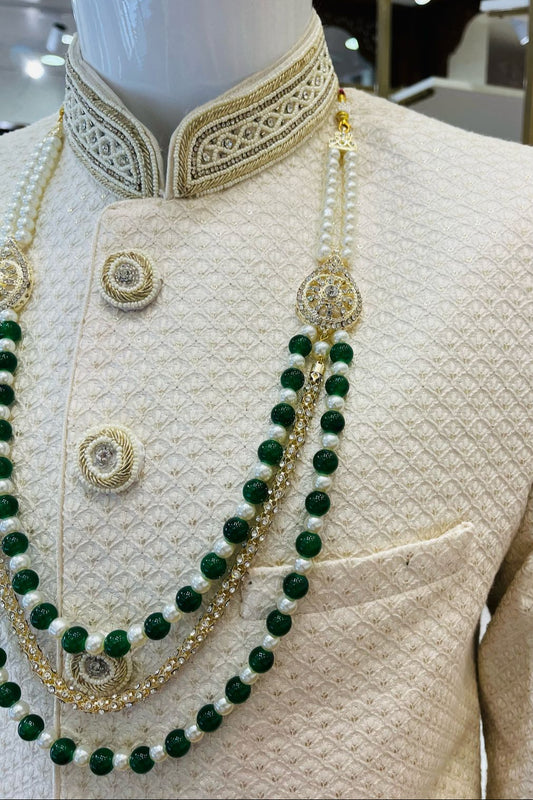 Ivory Kundan Groom Necklace with Green Stone Mala, Sherwani Jewelry Set