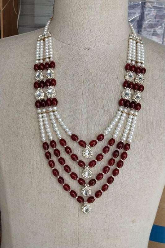 Golden Attire Maroon Indian Groom Mala | 4-Layered Pearl Necklace with Stone Detailing & Brooch | Kantha Style Sherwani Jewelry