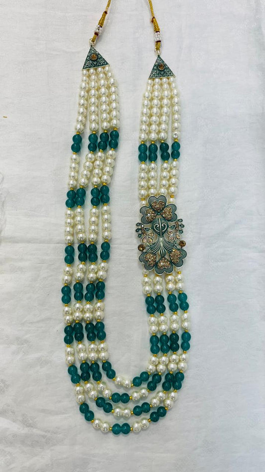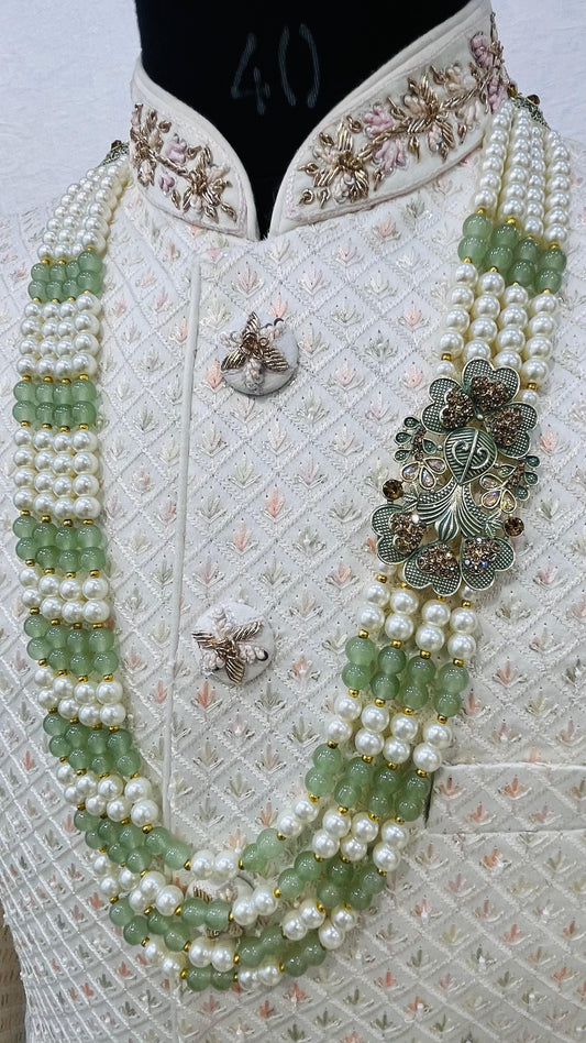Sage Green Indian Groom Pearl Mala | 4-Layered Kantha Brooch Necklace | Stone Detailing | Sherwani Accessory