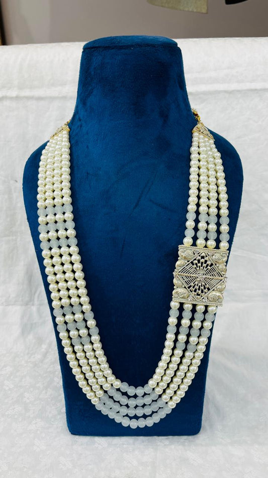 Grey Kantha Kundan Mala | 4 Layered Pearl Necklace with Stone Detailing Brooch | Indian Groom Sherwani Jewelry