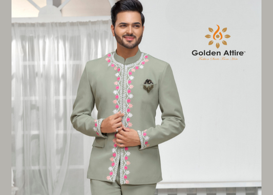 Custom Sage Green Jodhpuri Suit. with Intricate Thread Embroidery
