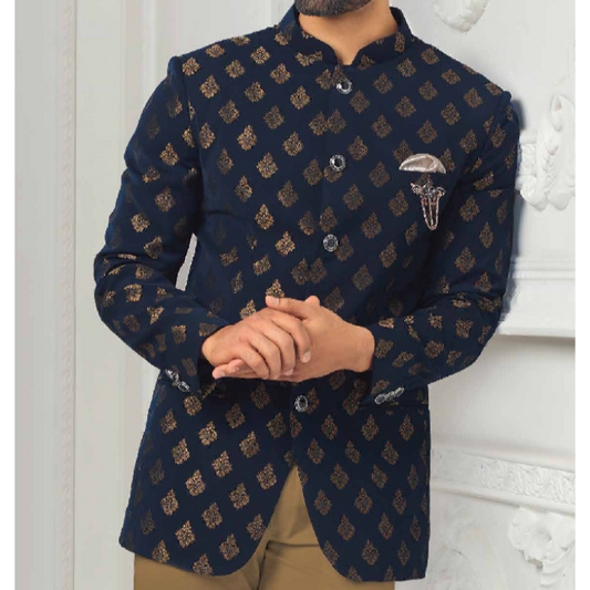 Navy Blue Jacquard Jodhpuri Suit | Bandhgala Suit | All Over Design Customizable Fit | Free Global Shipping | Golden Attire