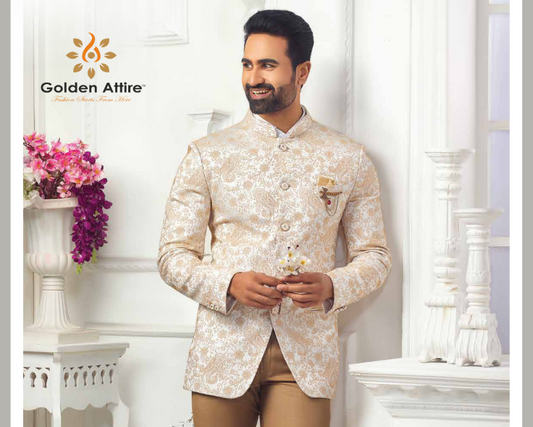 Customizable Beige Jodhpuri Suit in Luxurious Jacquard Fabric – Timeless Elegance, Tailored to You