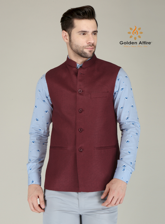Golden Attire | Timeless Maroon Nehru Jacket | Sustainable Jute Fabric | Customizable Design