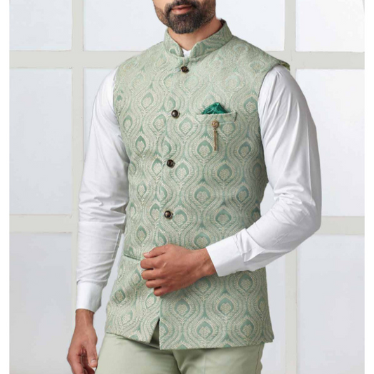 Golden Attire Sage Green Velvet Nehru Jacket | Customizable Elegance with All-Over Thread Embroidery