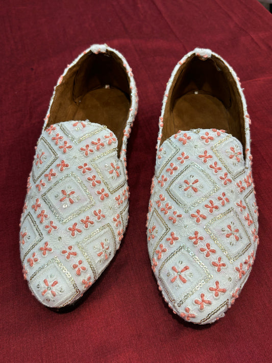 Ivory Handmade Mojari Loafers for Groom, Peach Embroidery Sherwani Shoes