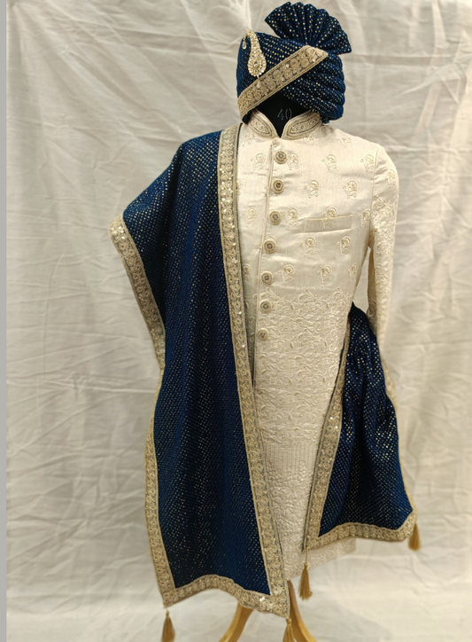 Cream Indian Groom Sherwani Shawl & Turban Set with Embroidered Border