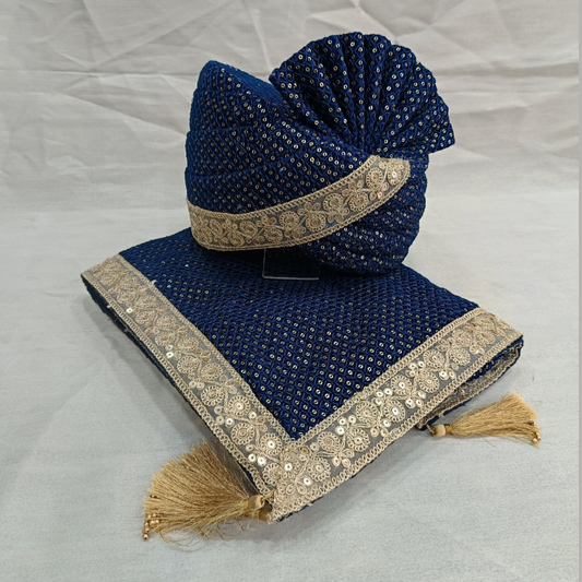 Royal Twill Blue Velvet Groom Turban Shawl with Golden Lace & Detachable Cream Kalangi | Adjustable Velcro (Shawl 65x250 cm)