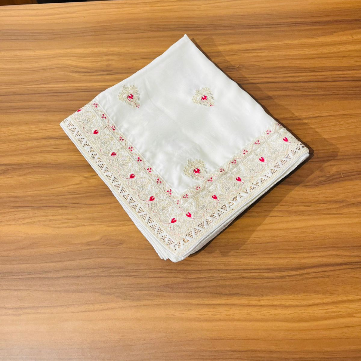 Exquisite Pink Booti Embroidery: The turban is adorned with a delicate and intricate pink booti design along its border. This beautiful embroidery adds a pop of soft color and luxurious texture, showcasing exceptional artisan craftsmanship.