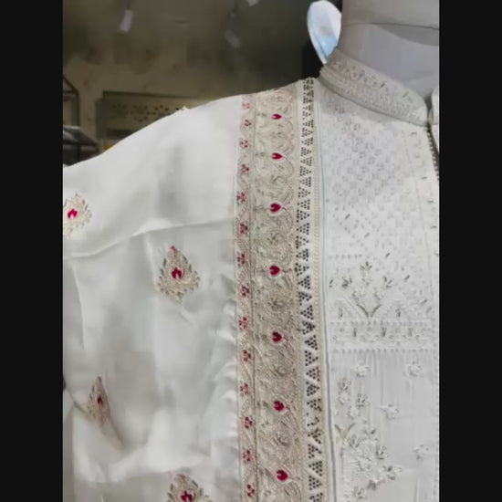 Regal Ivory Hue: The timeless ivory color symbolizes purity and royalty, offering a classic and sophisticated base that pairs flawlessly with any sherwani color, from vibrant reds and blues to elegant golds and blacks.