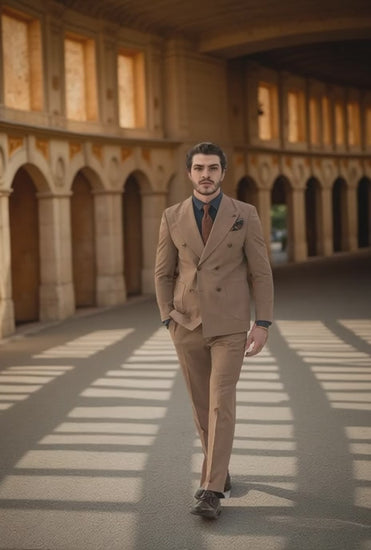 This elegant double-breasted suit is tailored from premium camel herringbone tweed wool, offering a sophisticated twist on classic groom attire. The rich, heathered camel tone and distinctive herringbone weave provide depth and character, perfect for autumn, winter, or rustic-chic celebrations.