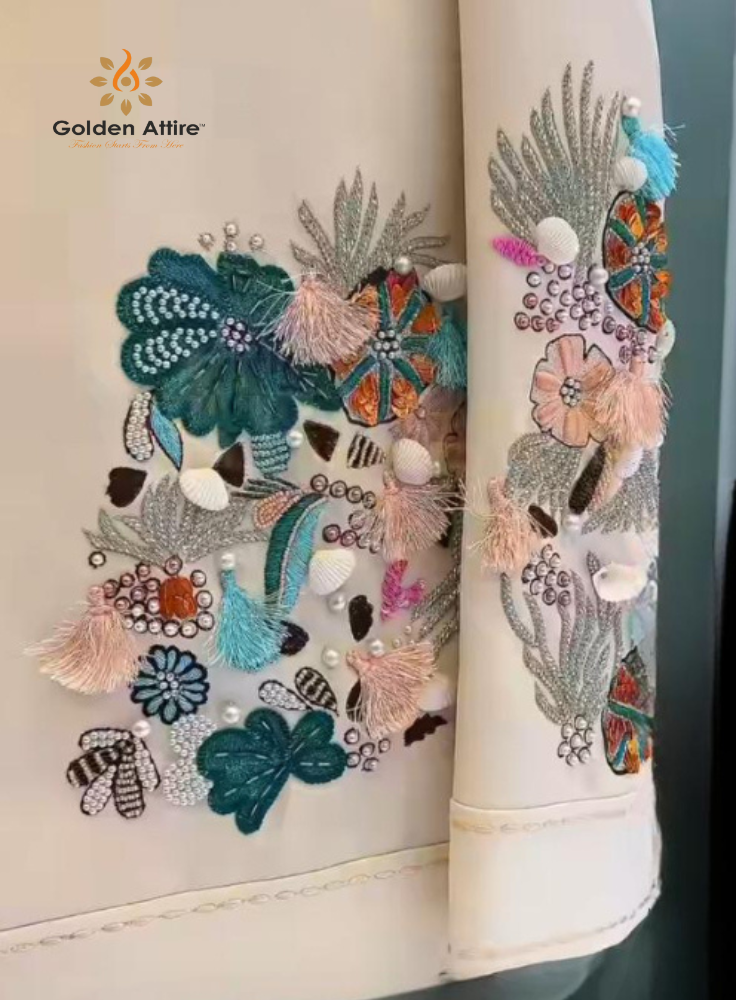 Hand-embroidered with breathtaking multi-color floral designs, real pearls, beads, natural sea shells, shimmering sequins, vibrant tassels and playful fringe details on premium cream/off-white base. Elegant tie-up / frog closures + detailed cuffs give it a very regal yet contemporary look.
