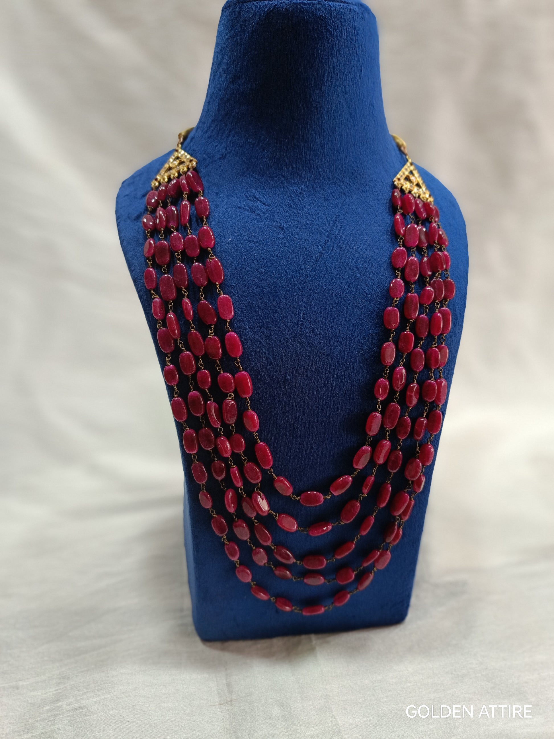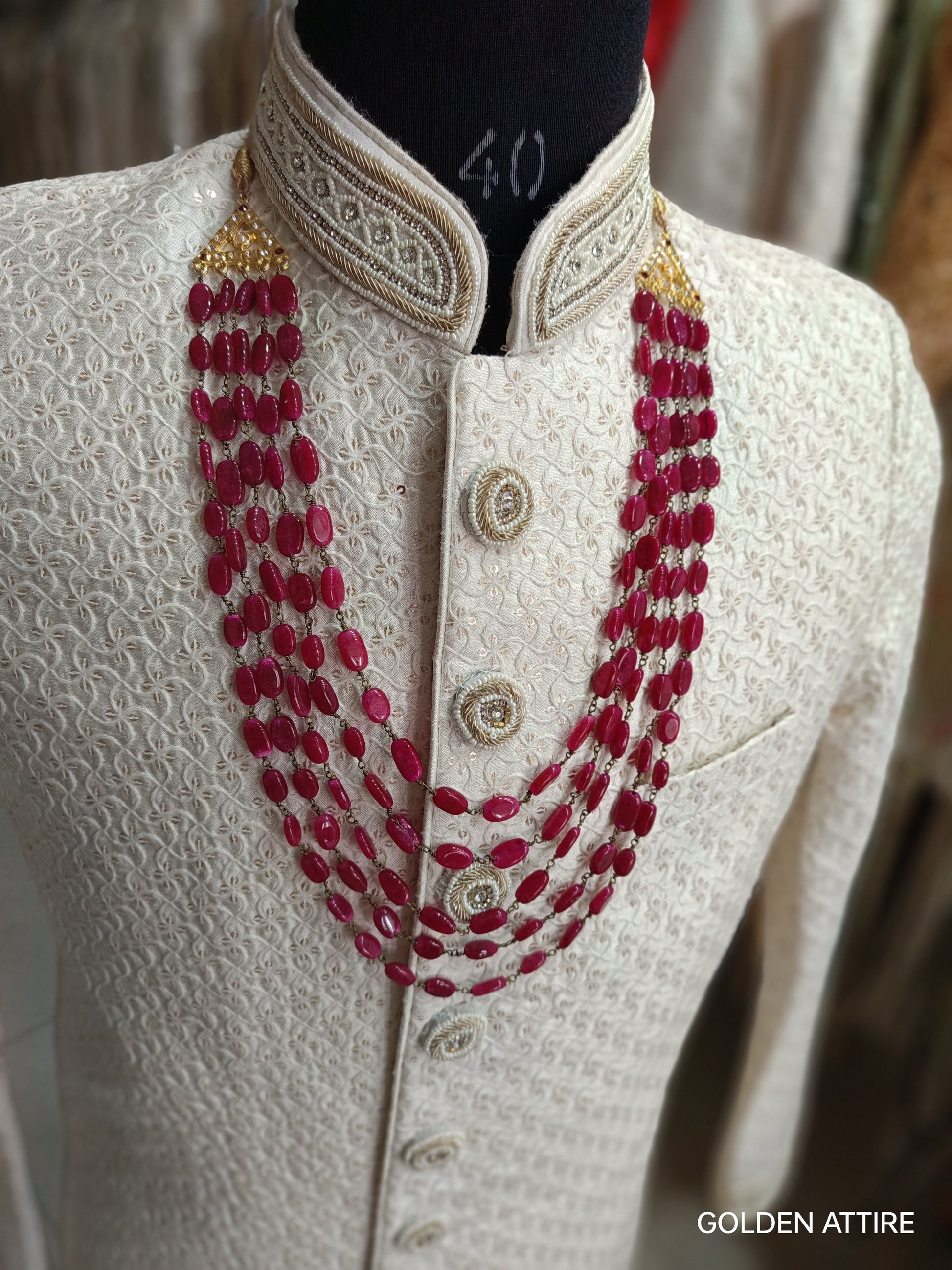 Indian Groom Mala 5 Layered Pearl Necklace | Ruby Stone Detailing | Uber Rich Kantha Panna Mala | Sherwani Necklace | Golden Attire