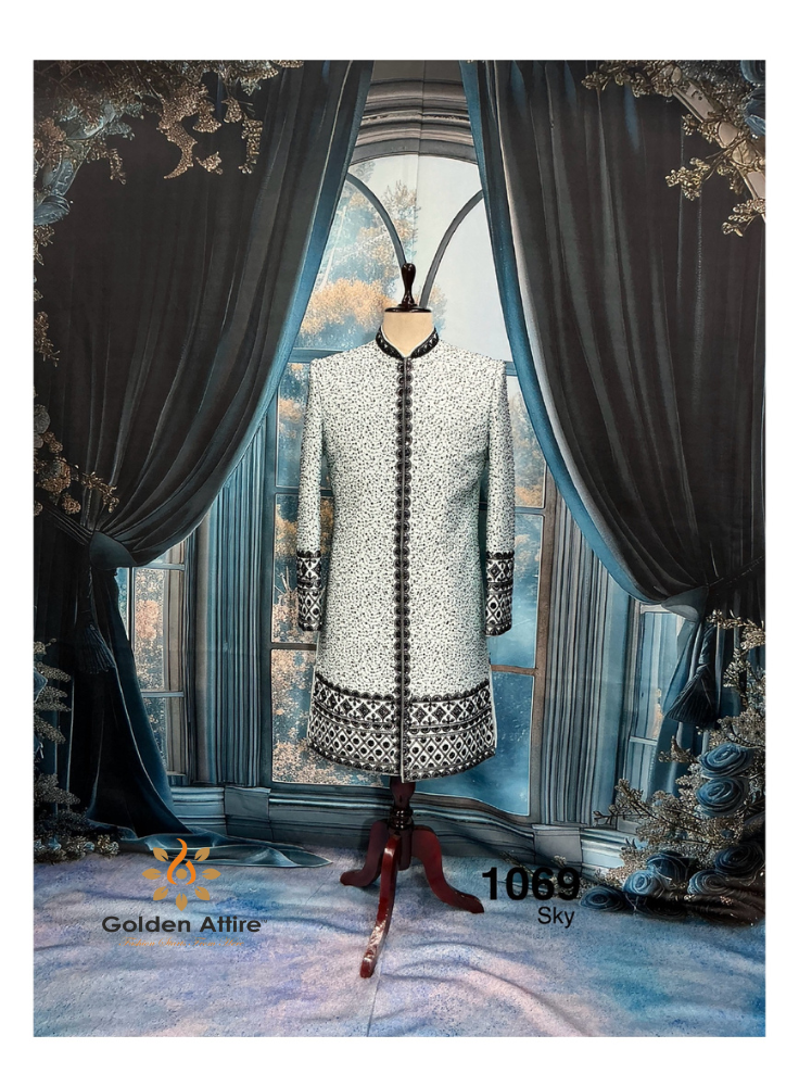 Step into your spotlight with this exquisite Light Sky Blue sherwani from Golden Attire, where contemporary style meets timeless Indian craftsmanship. Designed for the modern groom who appreciates sophistication, this Indo-Western masterpiece is tailored to make you look and feel extraordinary on your wedding day and beyond.