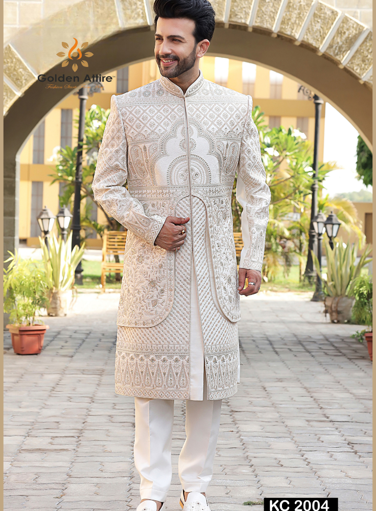 Elevate your wedding day with Golden Attire's latest masterpiece—an Ivory Groom Sherwani designed for the modern prince. Crafted with luxurious Art Silk, this double-layered sherwani features a shrug-style overlay for regal dimension, intricate zardozi work, and all-over thread embroidery that exudes opulence. Complete with a matching Churidar Pajama and discreet inside buttons, it blends tradition with contemporary elegance. Customize your fit for a flawless look, and enjoy free shipping worldwide.